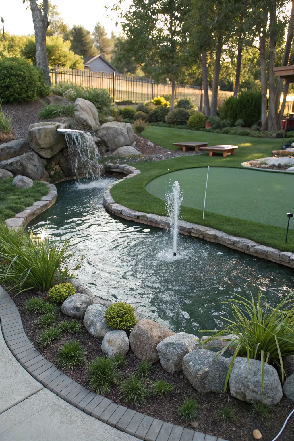 Elevate your backyard mini golf course with a touch of tranquility. #BackyardGolf #WaterFeature