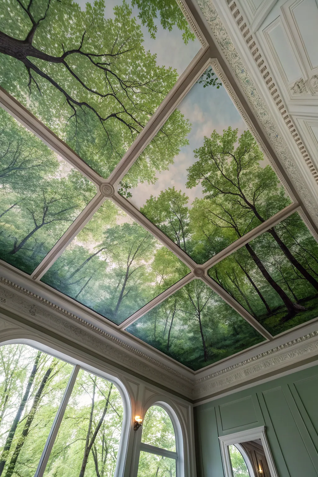 Convert your ceiling into a arboreal covering using verdant greens and outlines of arbors. It metamorphosed my reading alcove into a tranquil refuge.