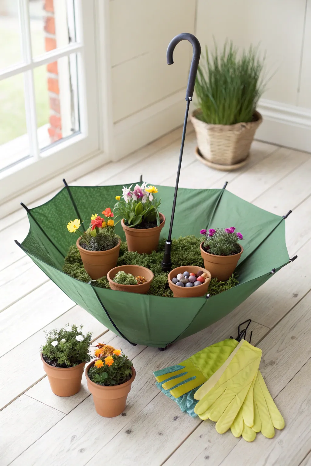 Transform a verdant umbrella into a garden-inspired hamper complete with miniature containers, grains, and protective hand coverings tailored for children. My budding botanist reveled in sowing her inaugural blooms and observing their ascent!