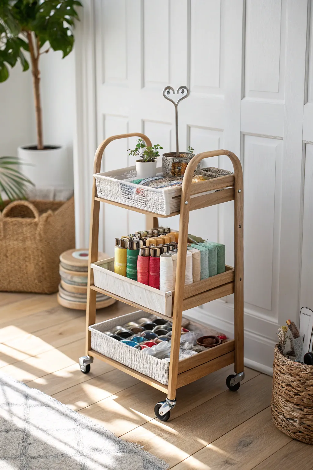 A rolling cart lets me move my whole work to any room. It’s great for crafting on the go, and the spaces keep everything neat.