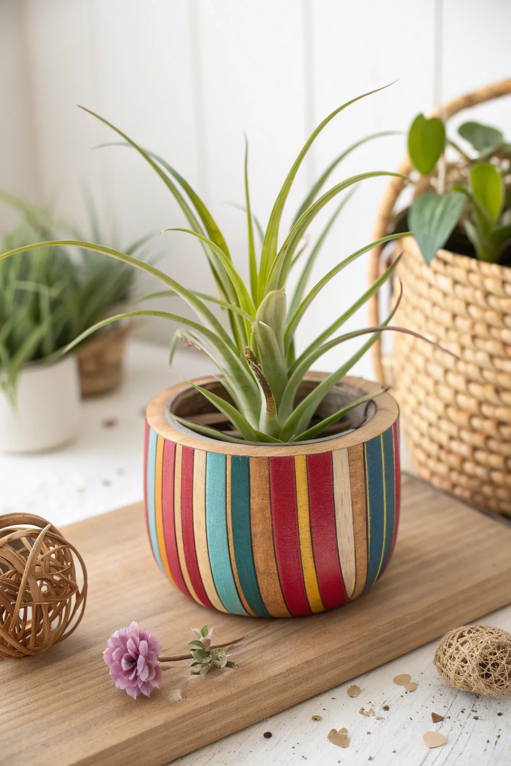 Convert an aged skateboard into vibrant, colorful fragments for accommodating air plants. Ideal for a youthful, daring atmosphere.
