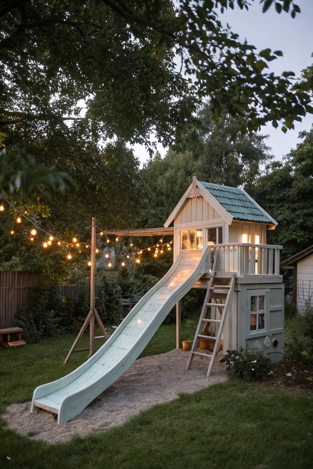 Affix a slide to an elevated abode for supplementary escapade. This configuration fosters climbing and exploration, transforming your yard into a miniature wonderland.