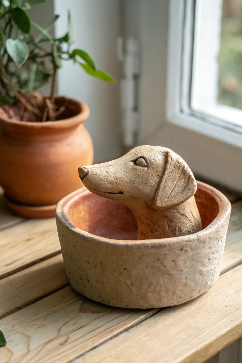 Explore a whimsical pup planter to give your succulents a lively dwelling. I particularly appreciate how the paws can support the plant, making it appear as if the puppy is cradling its verdant companion.