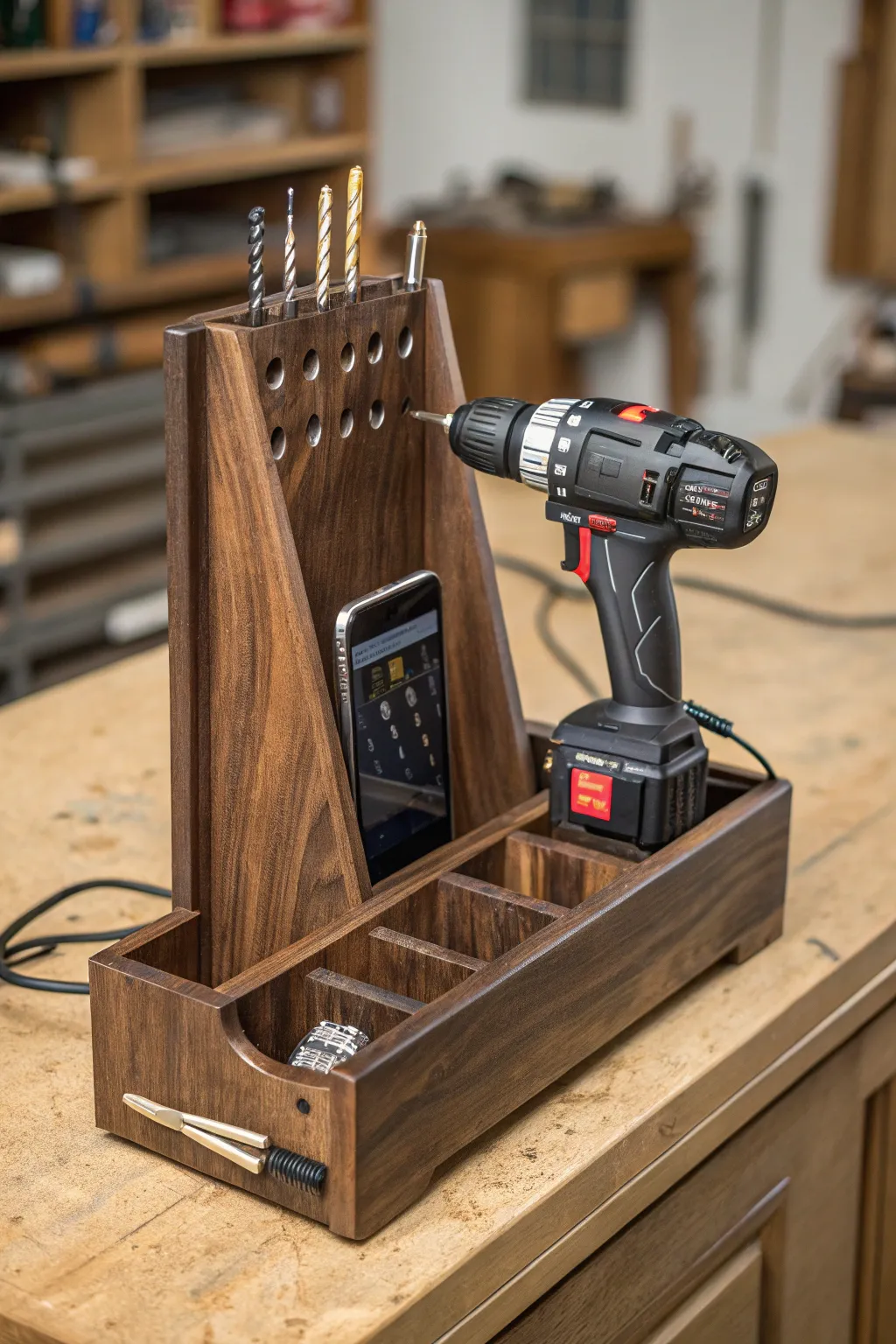 Incorporate an integrated power hub within your drill holder for a cohesive appearance. I’ve included one in my workshop, and it’s wonderful for maintaining everything charged and prepared.