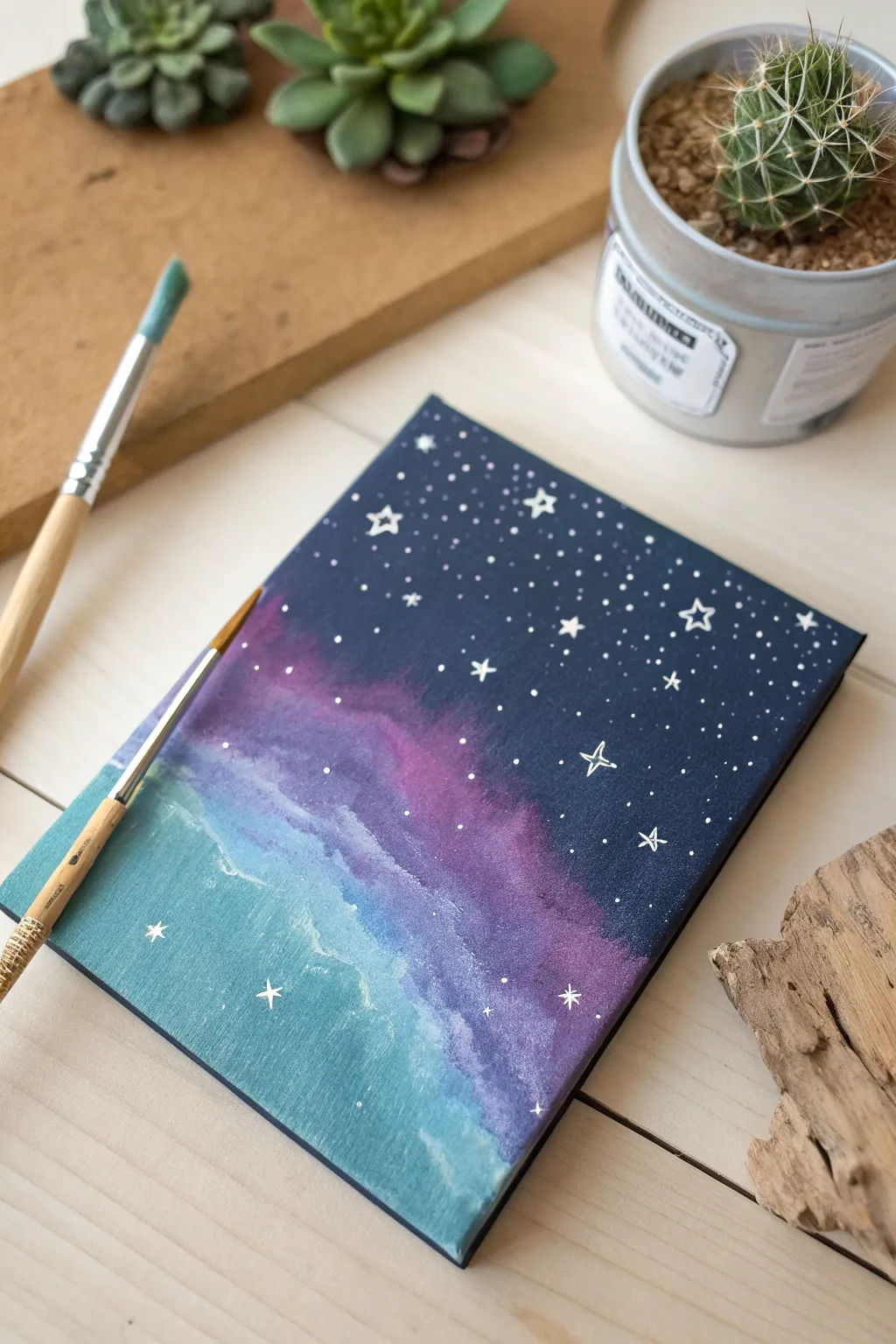 Journey into the cosmos with a celestial-inspired artwork featuring spiraling galaxies and sparkling stars. I find joy in employing a toothbrush to splatter white paint for the stars, creating an enchanting sense of depth.