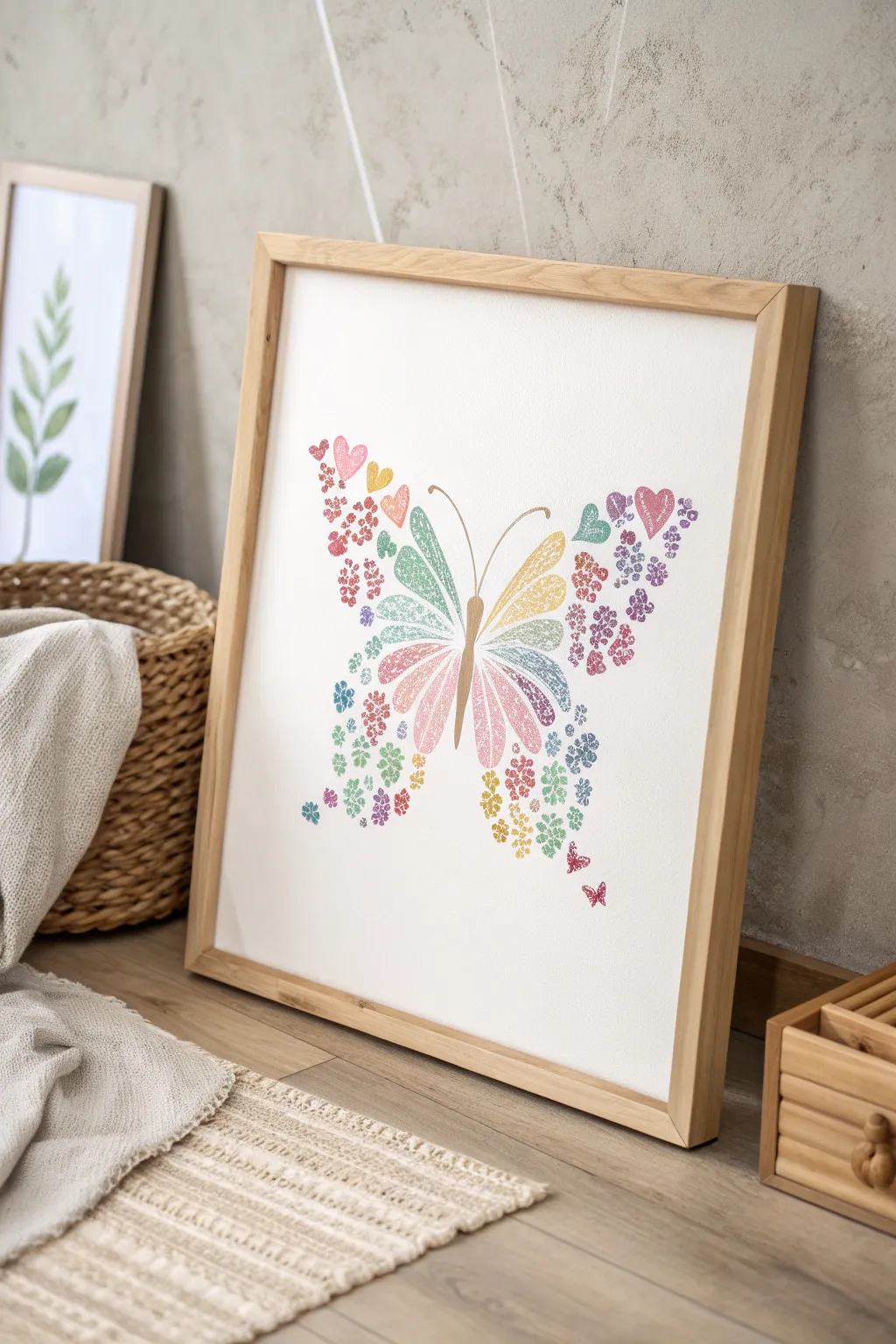 Craft a lepidopteran utilizing footprints as wings, capturing childhood innocence. This is a canvas that adorns my grandma’s living room, invariably drawing compliments.