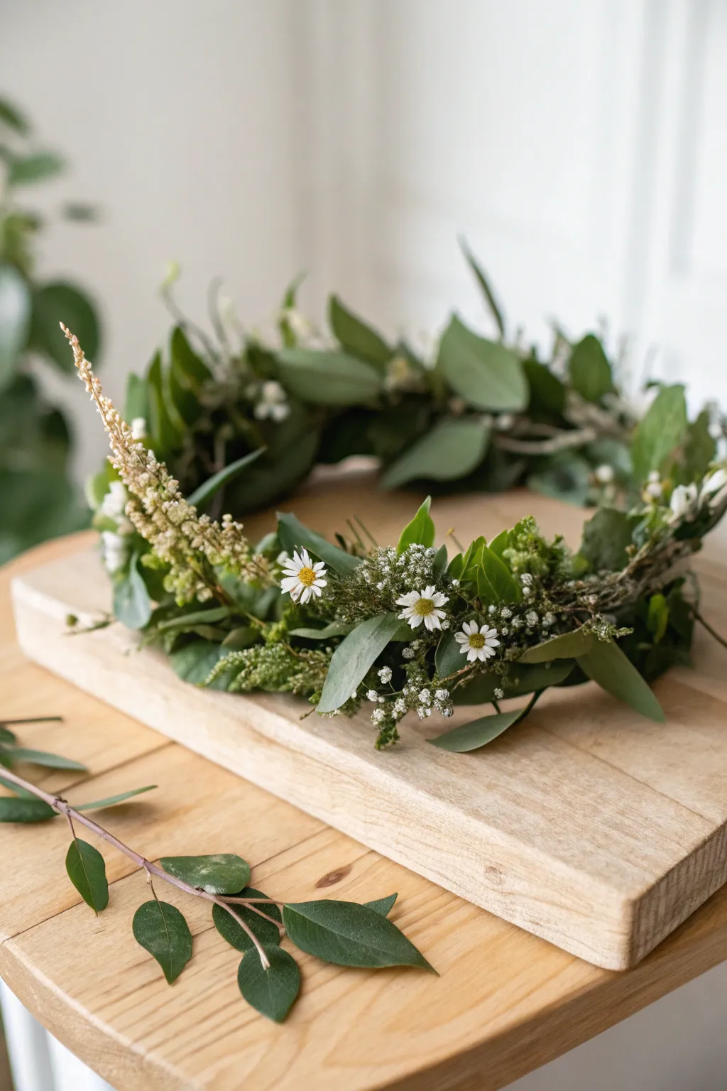 Collect green leaves and flowers, tape them onto a strip of paper, and create a majestic crown for your little prince or princess.