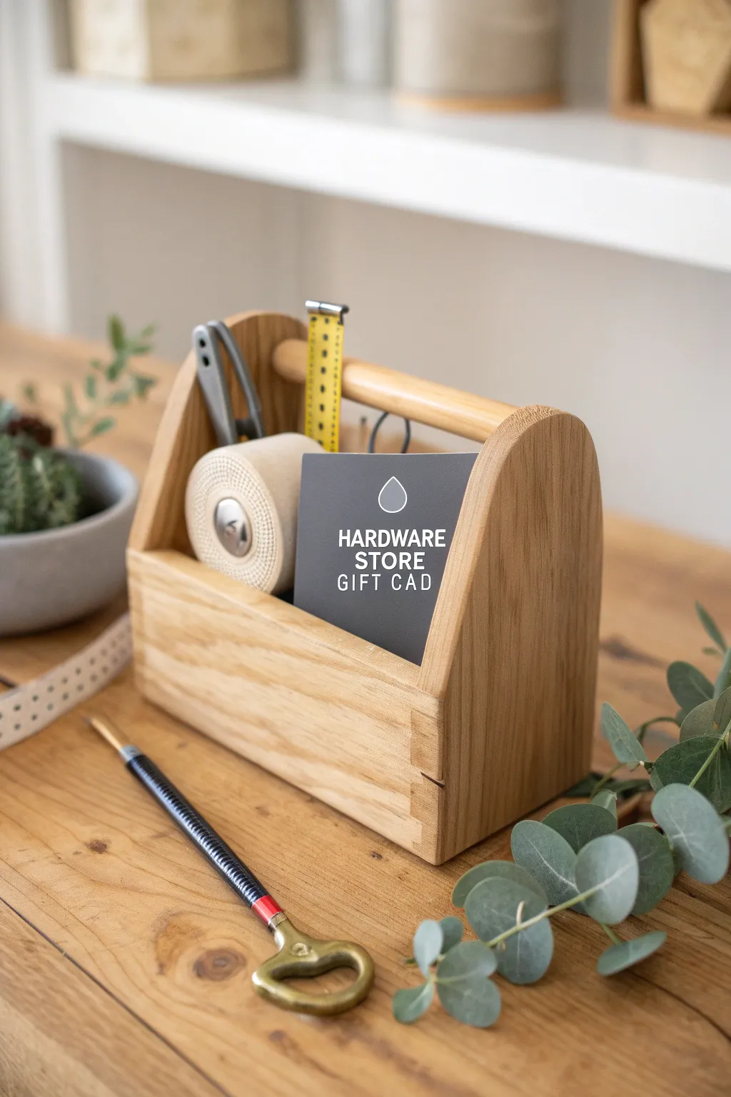 Utilize a tool caddy to organize a hardware store gift card with measuring tape and a mini hammer. It’s a gift that encourages limitless projects.