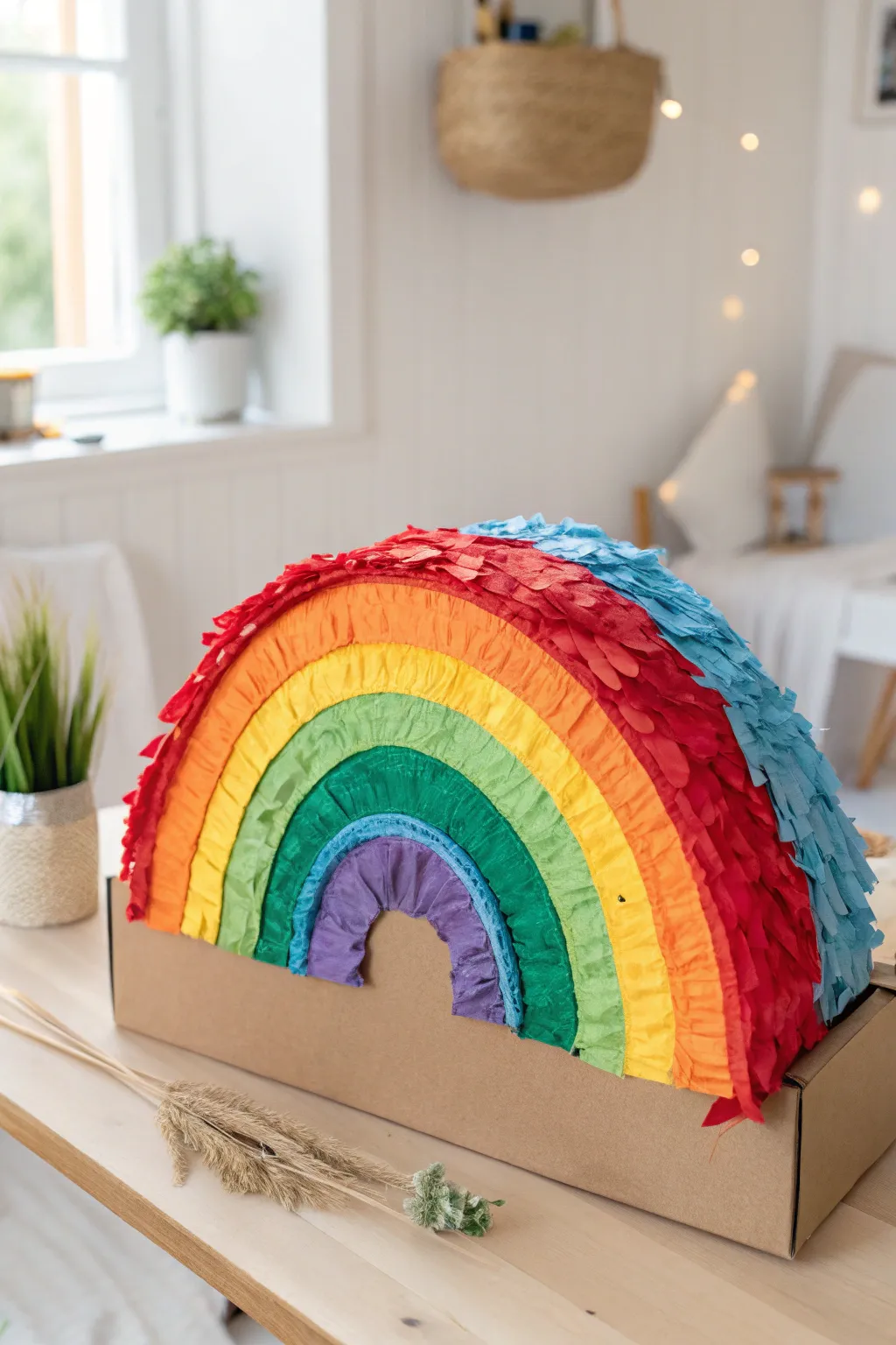 Revamp a cardboard box into a vibrant spectrum piñata, layering it with lively crepe paper. This idea often brings to mind my niece’s passion for striking, radiant hues and is an ideal fit for any joyous festivity.