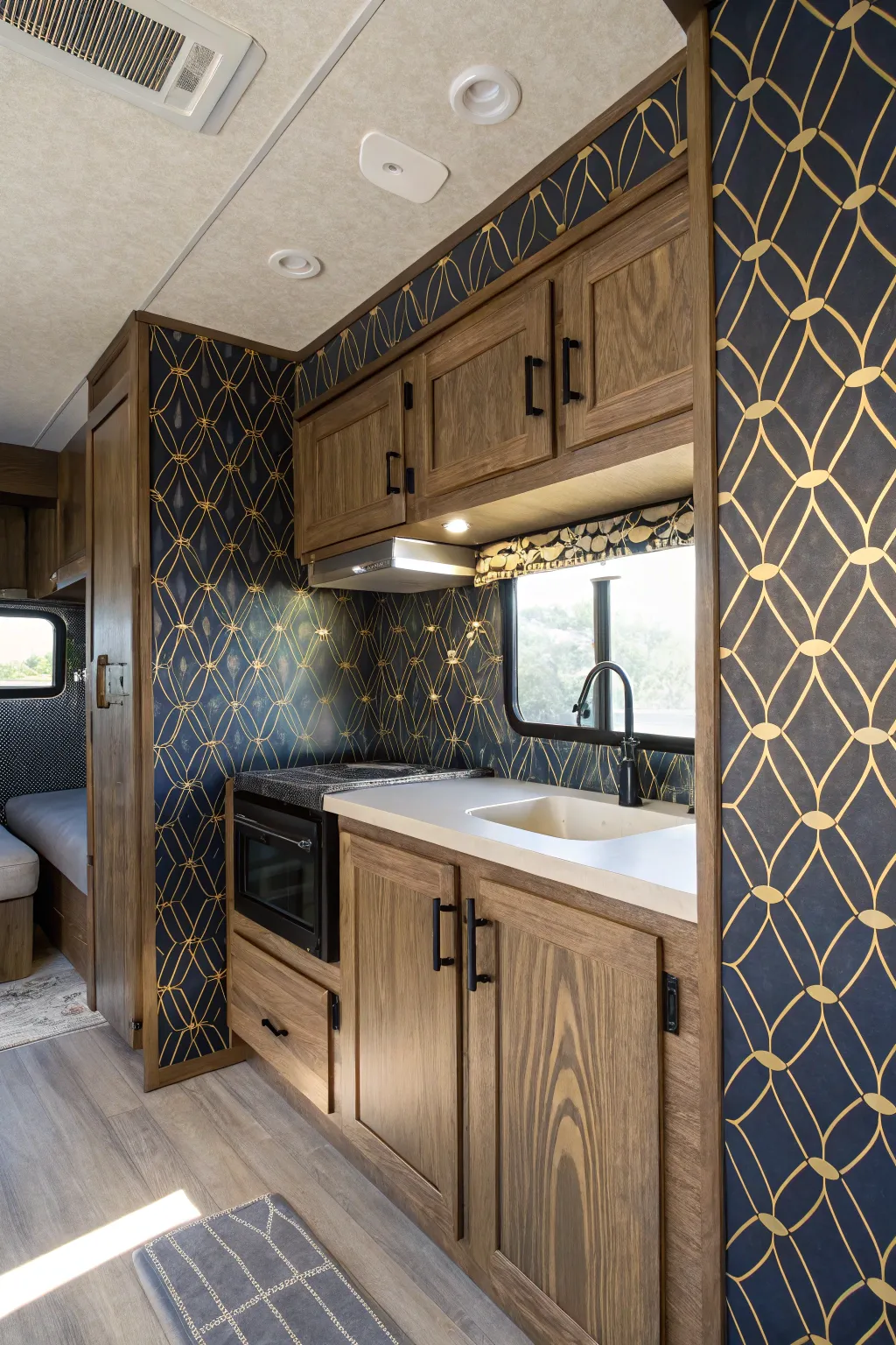 For a swift stylistic enhancement, experiment with adhesive wallpaper. It constitutes a facile, commitment-free avenue for infusing character into your mobile home sans the mess.