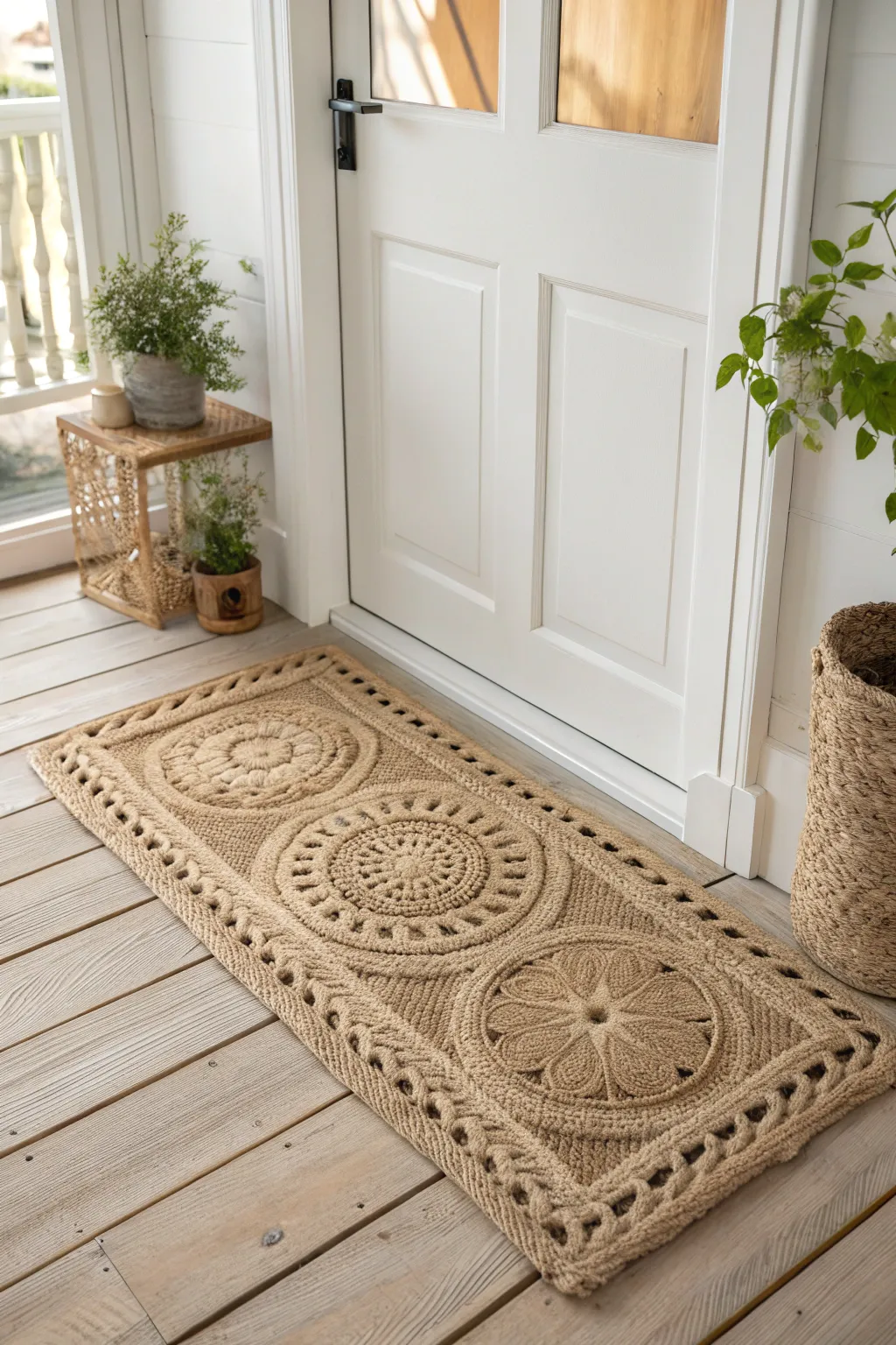 Fashion a compact jute floor covering for a welcoming adjunct to any chamber. I positioned one beside my front entryway, and it’s both utilitarian and inviting.