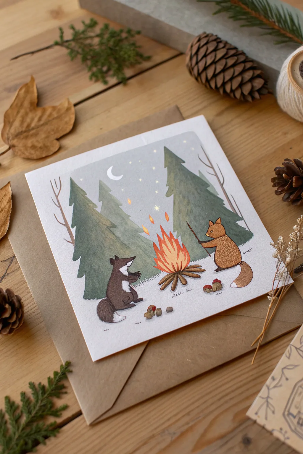 Envision a greeting card depicting creatures gathered around a radiant campfire. It’s a delightful means of conveying the balmy essence of a campfire indoors.