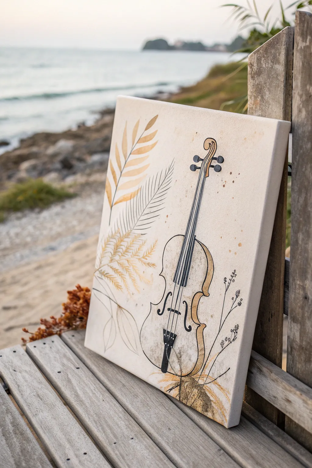 Mix different materials to depict musical instruments like stringed instruments or violins. This blended media method produces a tactile and rich art piece.