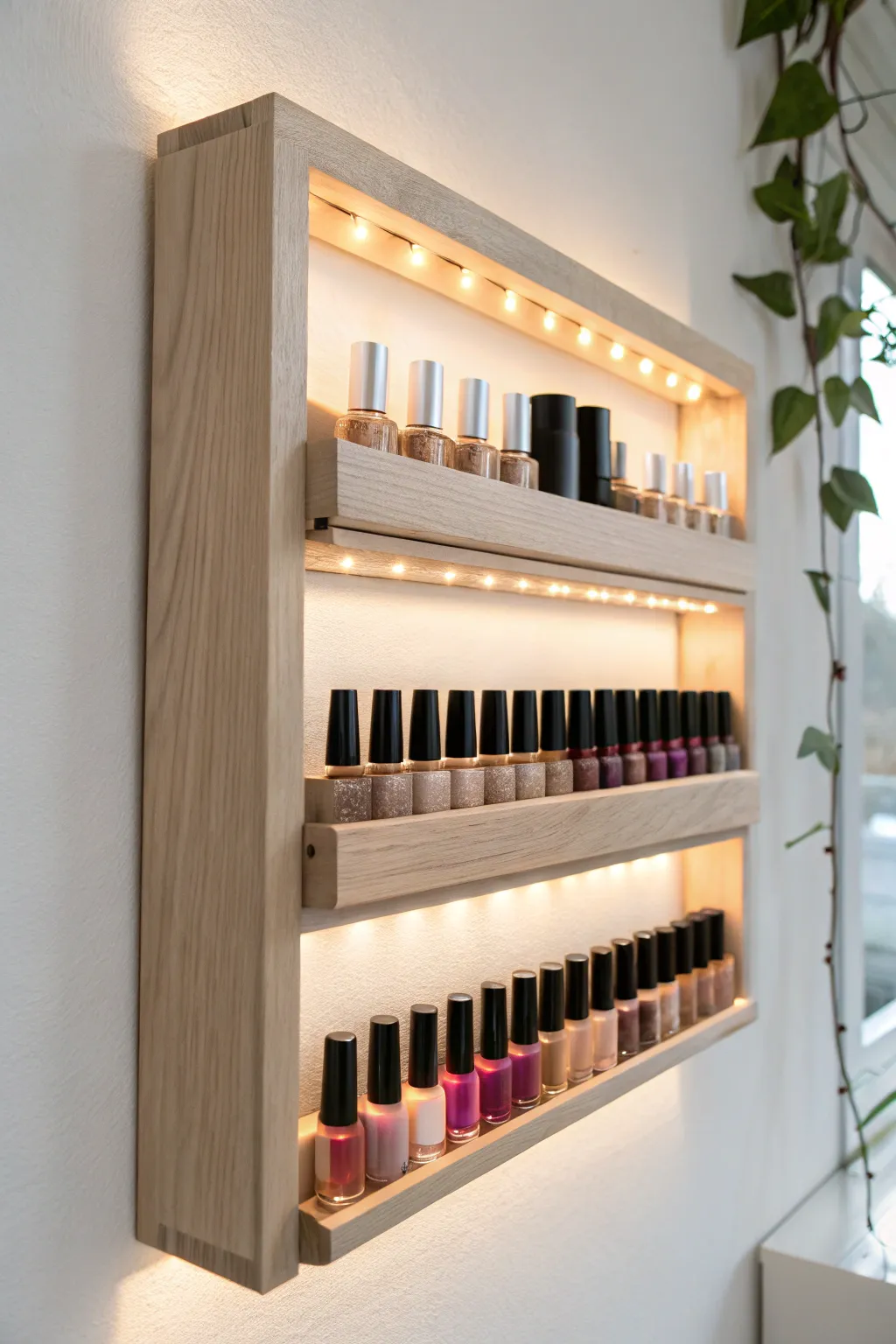 • Ornate Timber Shelving Units: Showcase your nail enamels with grace using these robust timber shelves, effortlessly enhancing your space.