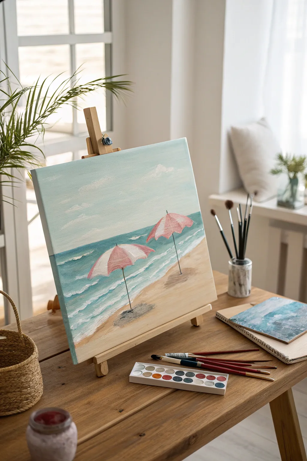 Picture yourself at the seaside with a scene of sun, sand, and sea. Use wide brushstrokes for the waves and add a few simple umbrellas to capture that perfect summer’s day.