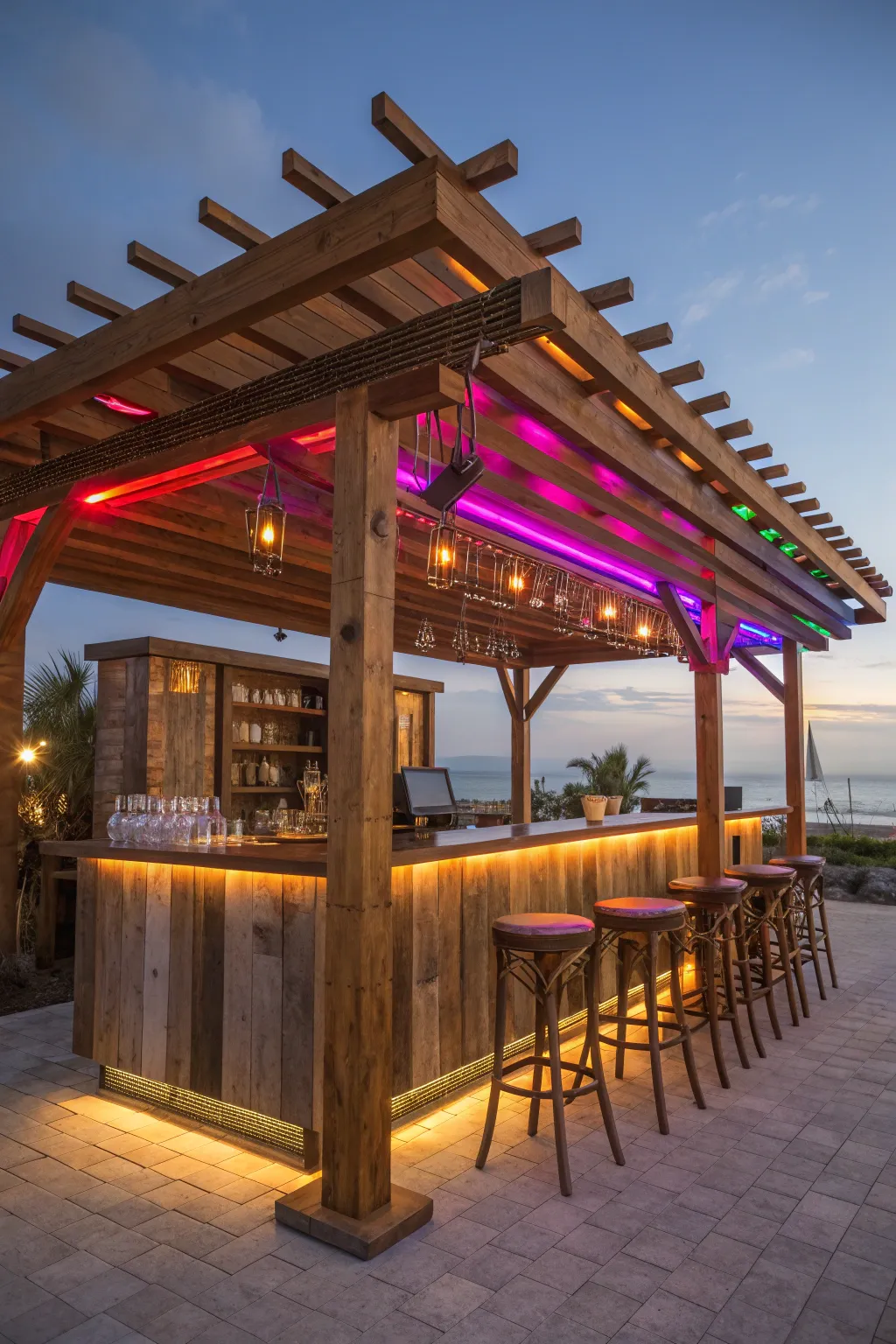 Transform your pergola bar into a vibrant oasis with hued LED illumination.