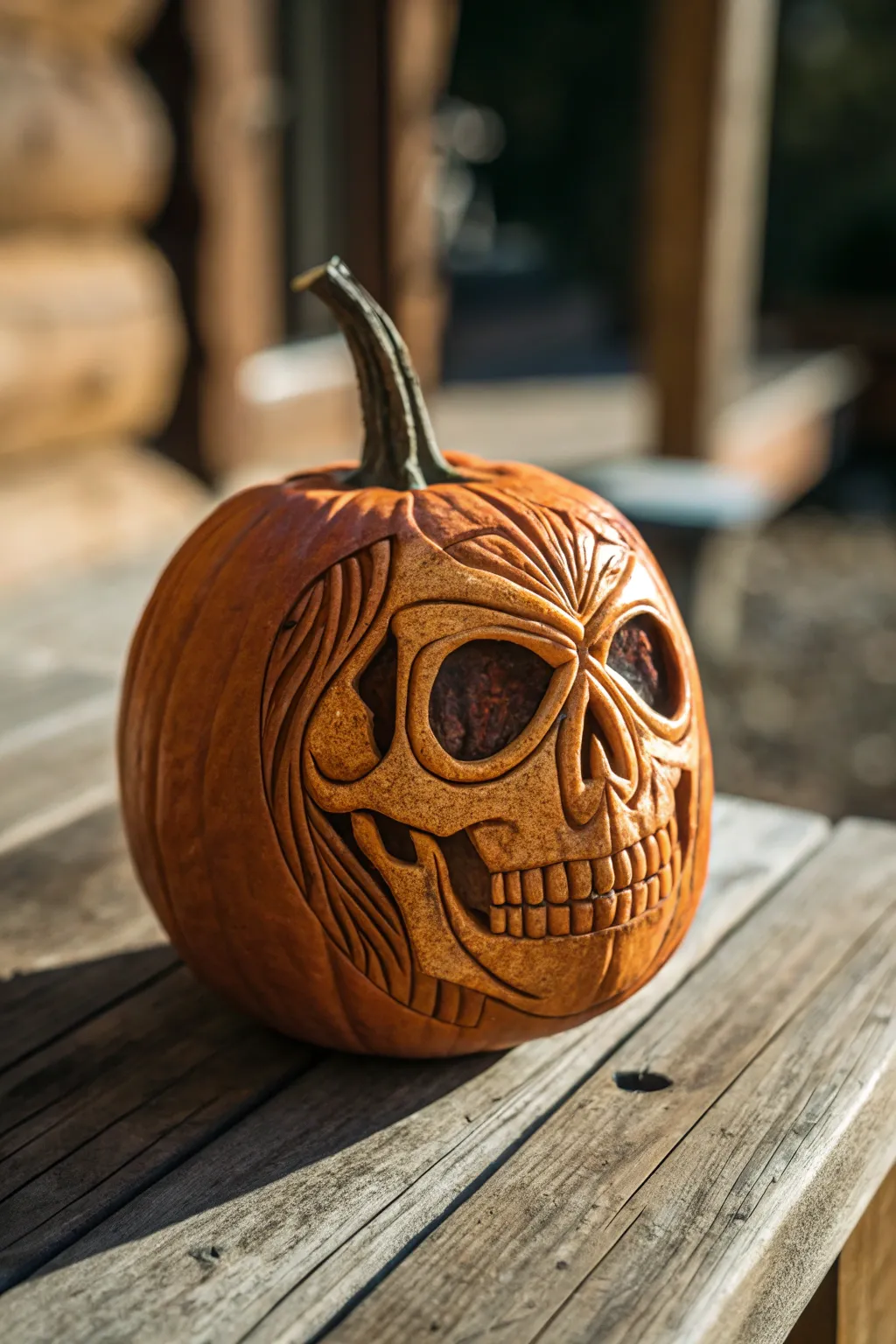 Unveil the mystery with a half-skull pumpkin carving masterpiece.