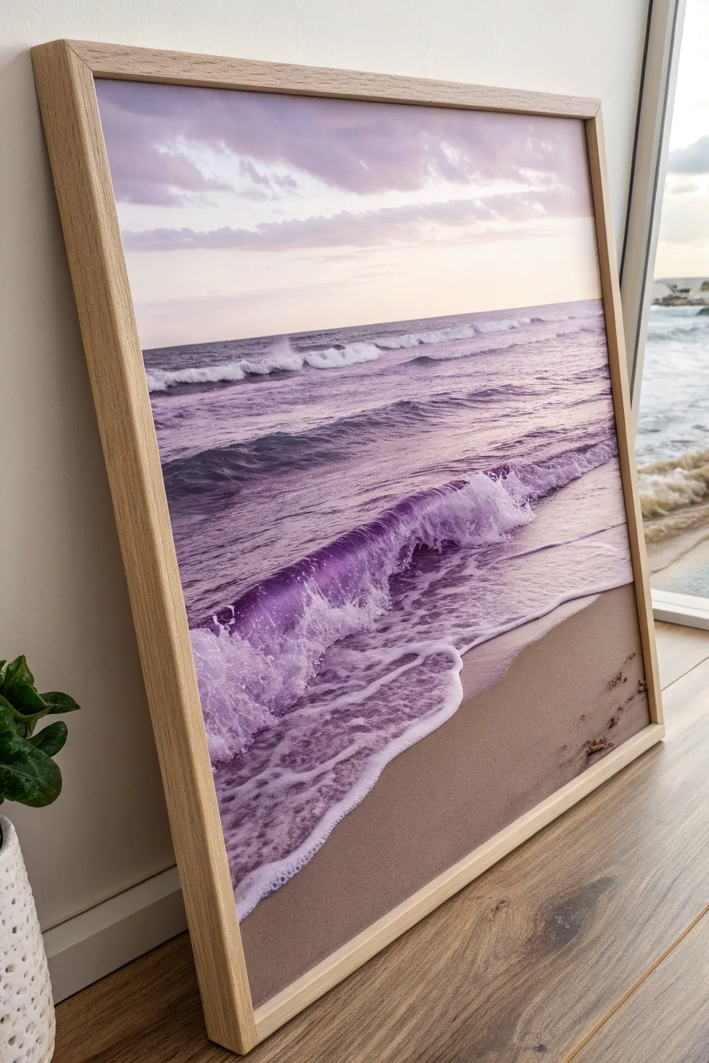 Show the movement of the ocean with violet waves hitting the shore. It’s a lively addition to a coastal-themed room.