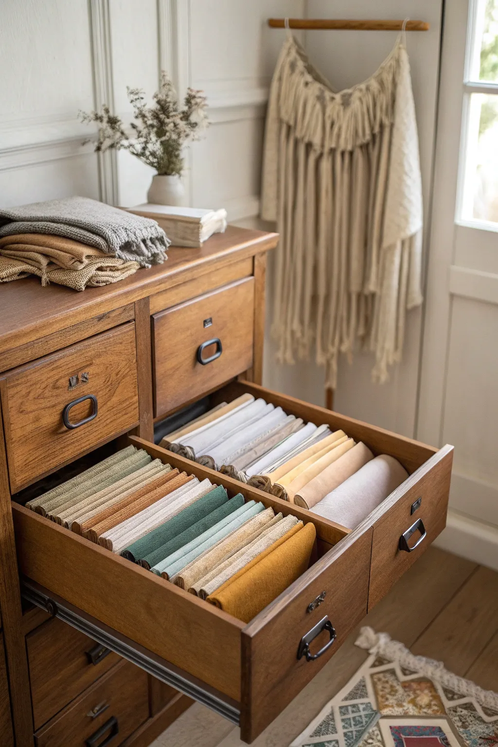 Vintage furniture like a dresser can be repurposed for fabric arrangement, utilizing drawers for distinct groupings. This charming and eco-friendly approach is ideal, and I adore the vintage atmosphere it contributes.