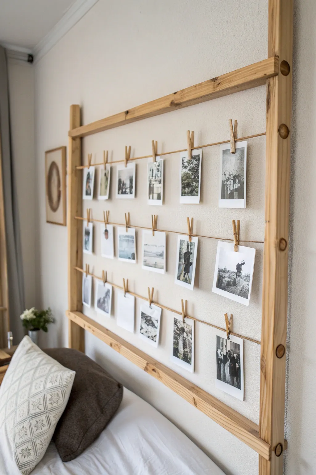Transform your memories with a rustic photo display rail, blending simplicity with boho elegance.