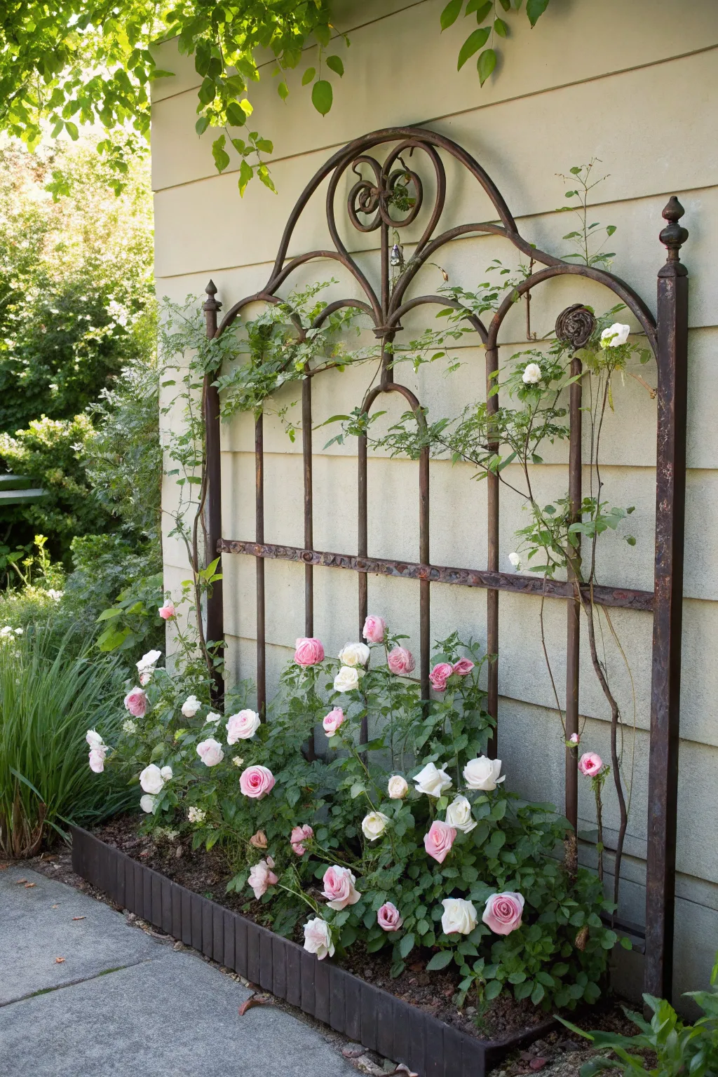 Elevate your garden with a hint of grace—let roses ascend your repurposed headboard trellis.