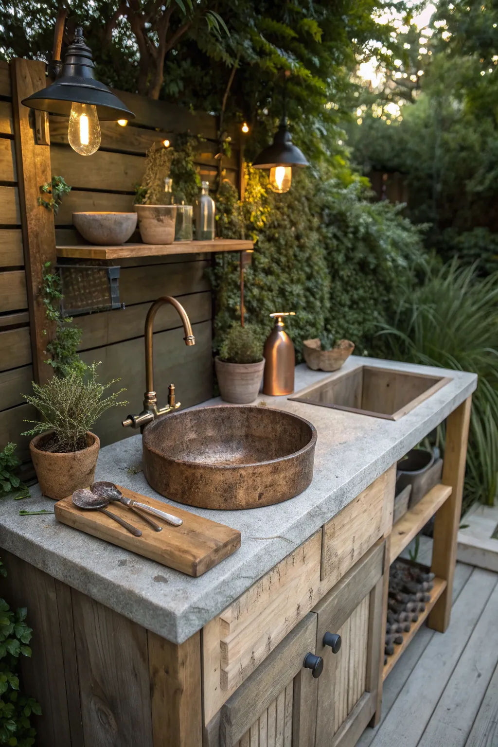 - Copper Kitchen Faucet: Refine your outdoor sink with a stylish copper faucet, uniting aesthetics with practicality seamlessly.