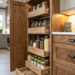 Transform your RV kitchen with this expertly crafted pull-out pantry for impeccable organization and style.