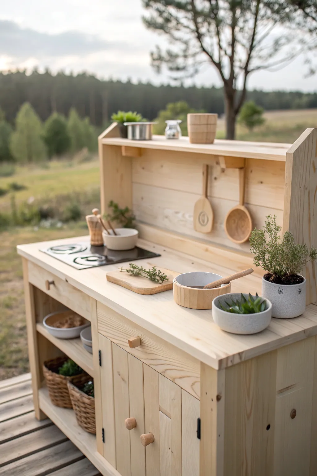 - Children’s Cookware Set: Outfit your mud kitchen with child-friendly utensils for secure and lifelike playtime cooking.