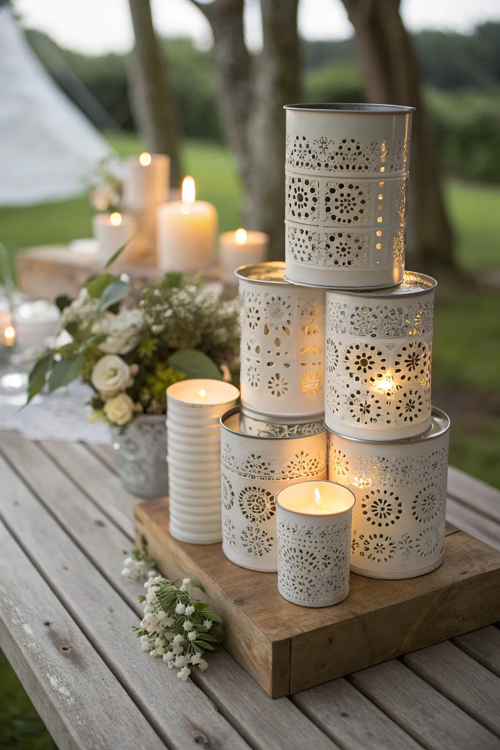 Pile metal containers of varying dimensions to fashion a distinctive candle stand. I relish employing them for intimate open-air suppers; the layered aesthetic is utterly charming.