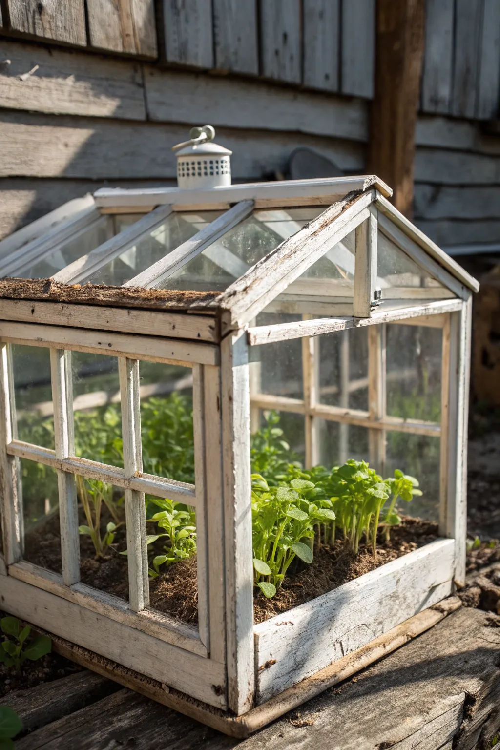 Fashion a miniature foliage sanctuary by assembling window frames into a quaint structure, perfectly suited for nurturing your flora with a hint of fancy.