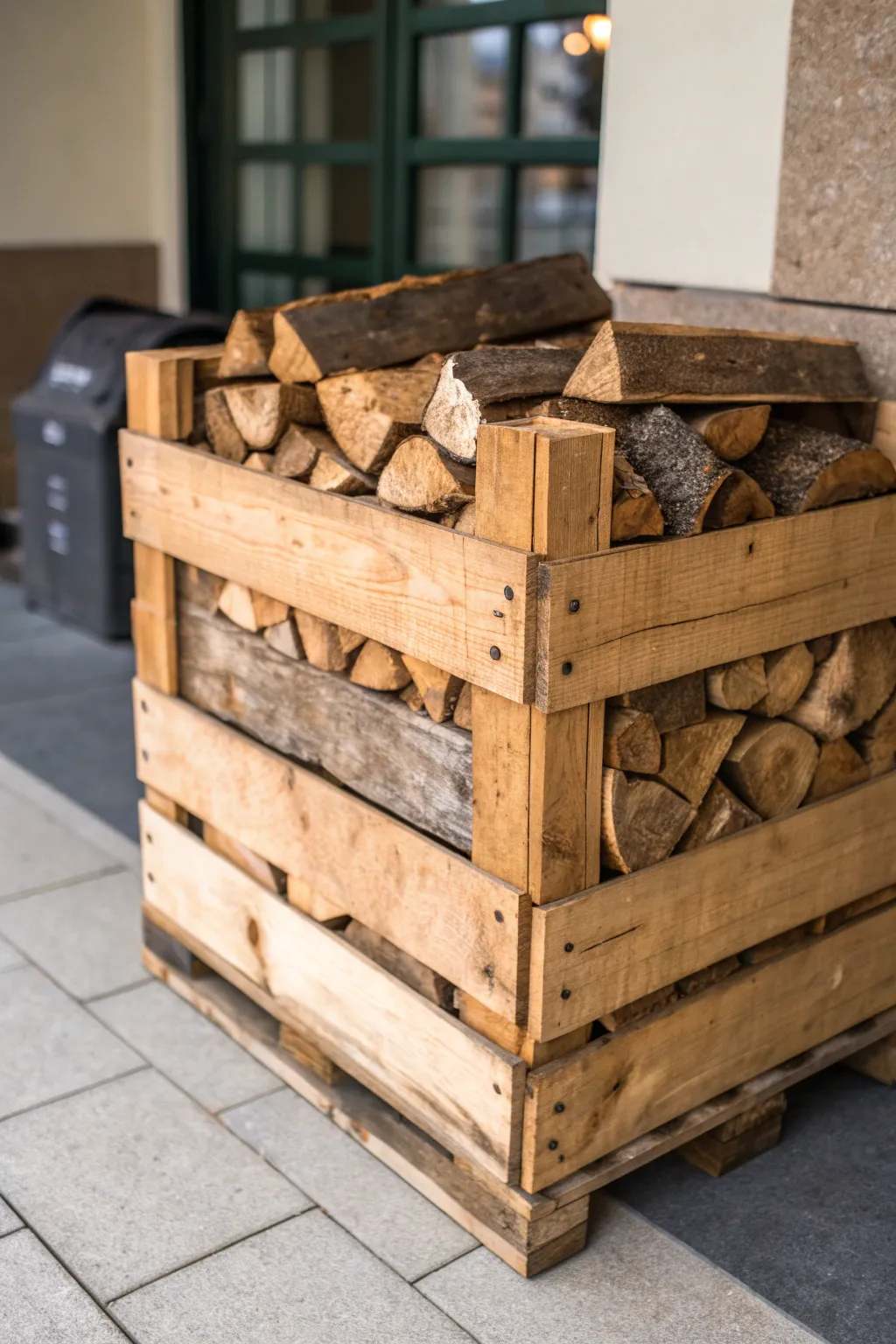 Place firewood in ornamental boxes that act as both storage and decor. I appreciate how they add countryside charm to my indoor and outdoor areas.